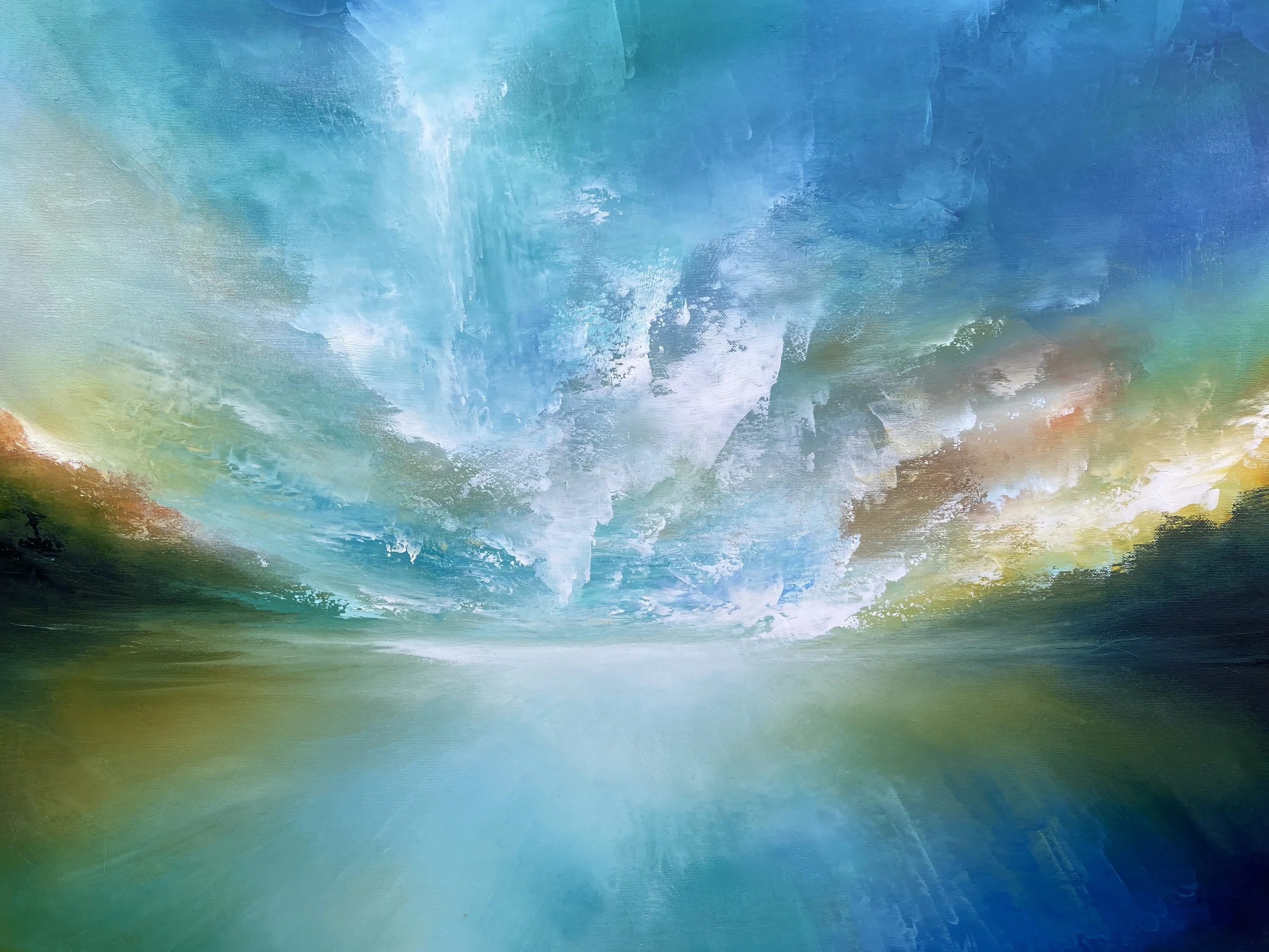Using the landscape as a metaphor, these works take the viewer on a journey through swirling mists, organic forms and iridescent skies.